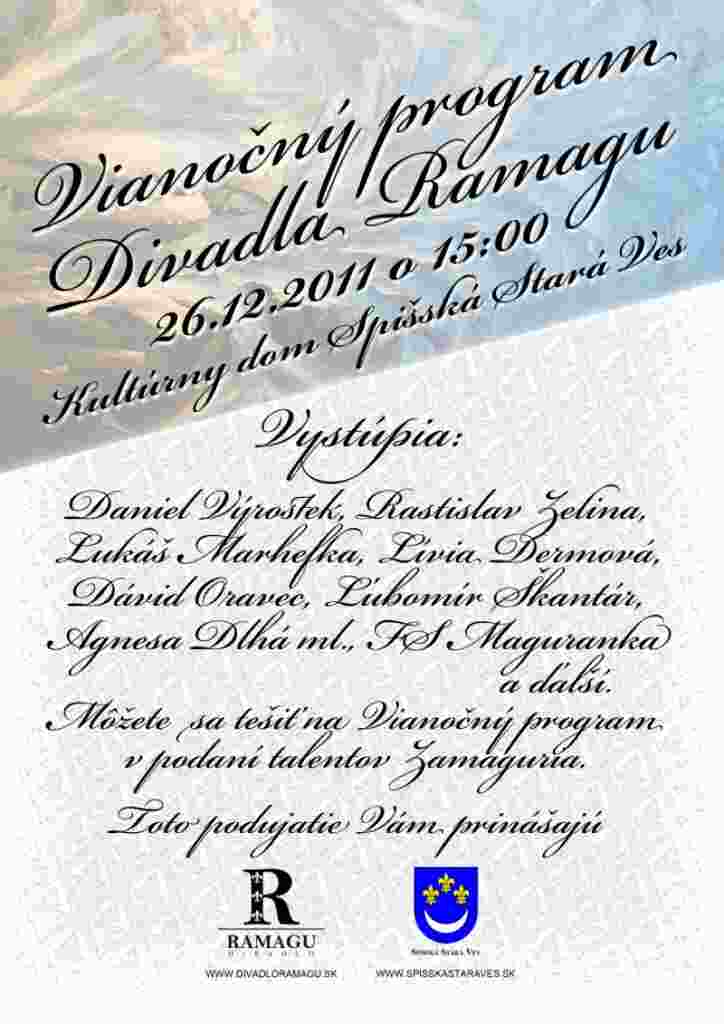 Divadlo RAMAGU Vás aj tento rok pozýva 26. 12. 2011 o 14,30 hod. na vianočný koncert pod názvom Galavečer talentov, kde budete mať možnosť vychutnať si vystúpenia známych zamamagurských talentov, ale aj nováčikov tohto podujatia. Tešíme sa na Vašu účasť.