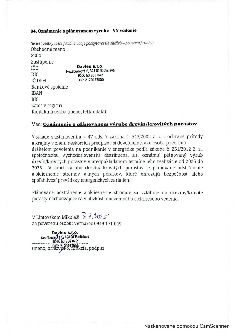 Oznámenie o plánovanom výrube - NN vedenie